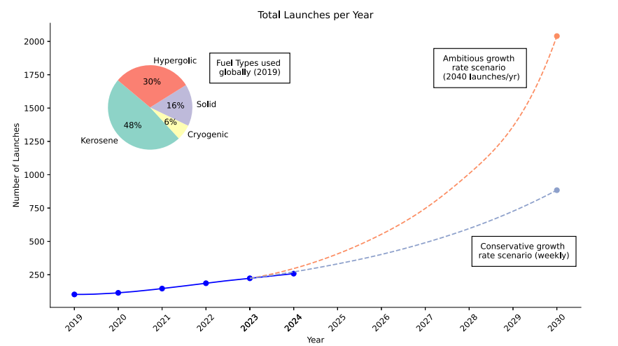 The current and projected number of orbital launches through 2030. Credit: Climate and Atmospheric Science.