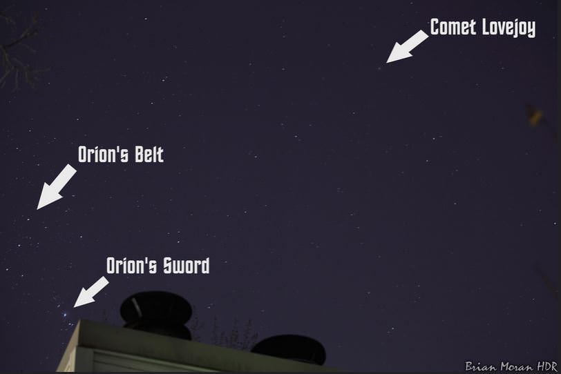 has snapped the perfect picture to show you EXACTLY where to look for the comet. All you need to do is look for the easy-to-find constellation of Orion, and swing your eyes to the right (about 20 degrees) and up slightly up.