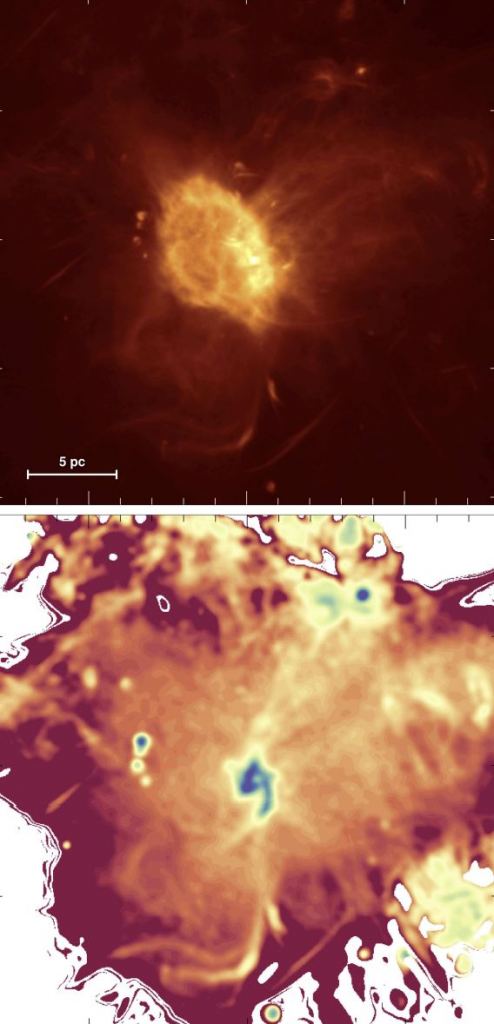 There have also been outbursts of energy from the supernovae explosions and star formation in this region. It's possible the filaments are created by the interaction of both the radio bubbles and star formation as the magnetic fields of energized gases expanding from the black hole become entangled with outbursts from stellar formation and explosions. The black hole's outbursts also accelerate electrons along the length of the filaments themselves.