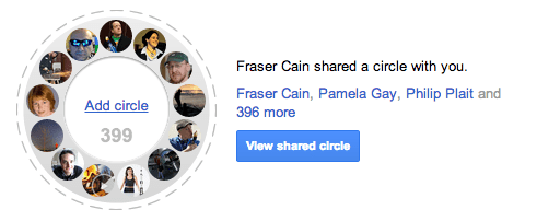 . This is a pre-made circle containing 400 people who actively post on Google+ about science topics. There are some big names there, including astronauts, professors, researchers, students, journalists, and lots of science enthusiasts. I carefully curate this list to make sure each and every person on the list is active and regularly posts about science.
