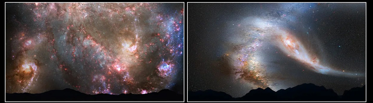 *Two scenes from the possible merger between Andromeda Galaxy and the Milky Way Galaxy. Notice the starburst regions and gas clumps being driven by the merger. Courtesy: NASA; ESA; Z. Levay and R. van der Marel, STScI; T. Hallas; and A. Mellinger*