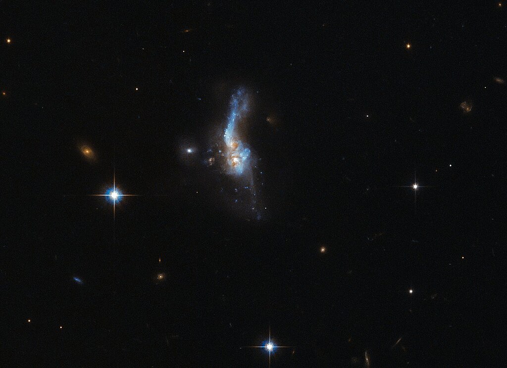 *IRAS 14348-1447 is a good example of a ULIRG. It lies more than a billion light-years away and shows all the hallmarks of a galaxy collision, including the distorted shape, starburst areas, and clumpy clouds. Courtesy: ESA/Hubble*