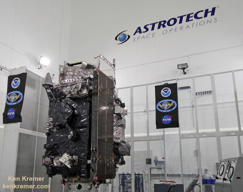The NASA/NOAA GOES-R (Geostationary Operational Environmental Satellite - R Series) being processed at Astrotech Space Operations, in Titusville, FL, in advance of planned launch on a ULA Atlas V slated for Nov. 19, 2016. GOES-R will be America's most advanced weather satellite. Credit: Ken Kremer/kenkremer.com