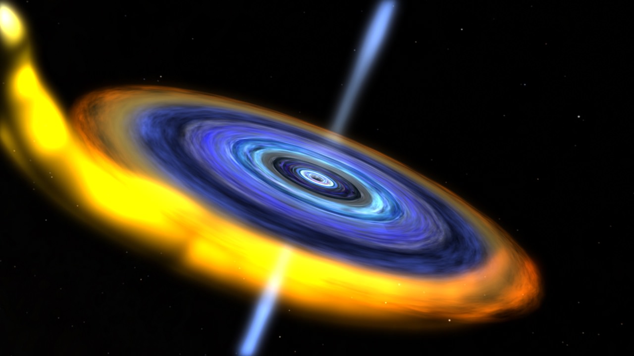 Binary GRS 1915 has some very cool characteristics. Right now astronomers have observed jets blasting out in opposite directions cruising along at 98% the speed of light. These originate at the event horizon where strong magnetic fields fuel them and each pulsation matches the occurrence of the jets. By observing the X-ray spectrum with RXTE, researchers have discovered the interior of the disk creates enough radiation to halt the gas flow - an outward wind which negates the inward flow - and shuts down activity. As a result, the inner disk glows hot and bright, eliminating itself as it flows toward the black hole and kick starts the jet activity again. It's a process that happens in as little as 40 seconds!