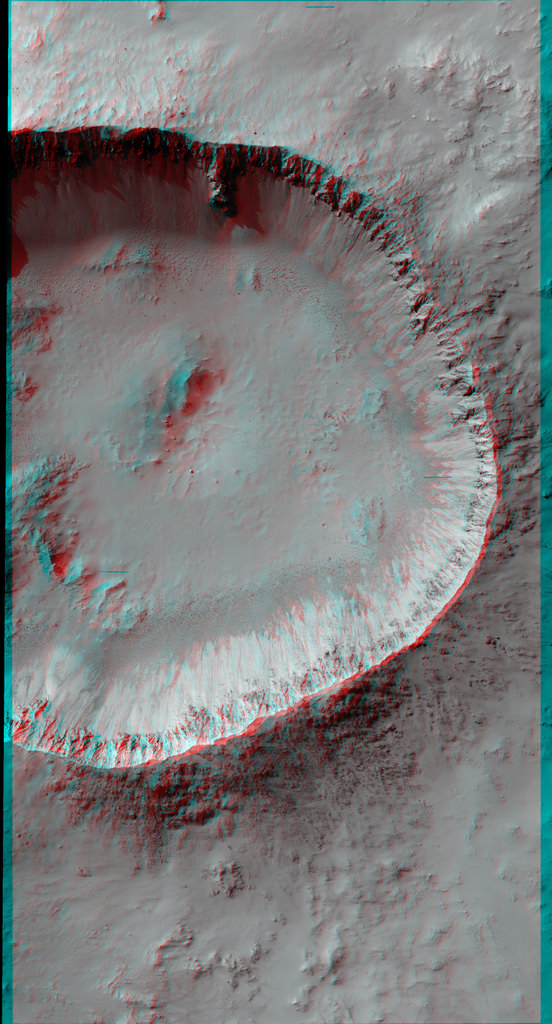 This is why I always keep a pair of 3-D glasses by my computer. This well-preserved crater on Mars may look like just your average, run-of-the-mill impact crater in 2-D, but in 3-D, the sharply raised rim, the deep, cavernous crater body, and especially the steep crater walls will have you grabbing your armchairs so you don't fall in. The image is courtesy of the HiRISE camera team from the Mars Reconnaissance Orbiter. This unnamed crater is about 6 or 7 kilometers wide from rim to rim. HiRISE took the image on New Year's Eve 2011.