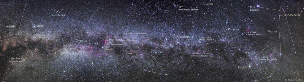 is really amazing, and you definitely want to click on the image to have access to larger versions! This is an 18-image mosaic taken with a Canon 60Da, with 60 second exposures, and it rivals wide-field images taken by larger ground-based telescopes. The images, were, however, taken from the home of some of the darkest skies and largest telescopes in the world, near Roque de Los Muchahos, in La Palma, Canary Islands. Visible is the hazy band of white light that comes from unresolved stars and other material that lie within the galactic plane, contrasting with interesting shapes within the dark regions of the band, corresponding to areas where light from distant stars is blocked by interstellar dust.
