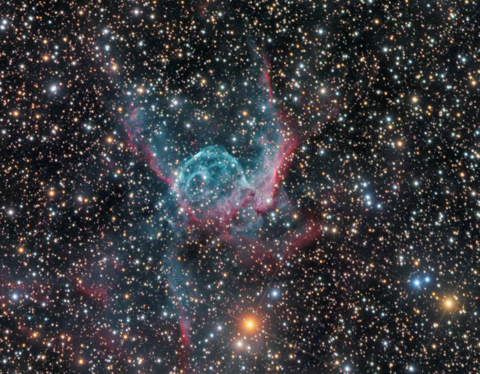 It's a stunning look at what is known as Thor's Helmet. This helmet-shaped feature (complete with wings!) is an emission nebula is located in the constellation of Canis Major, about 15,000 light years from Earth. The nebula is a large expanding bubble illuminated by a central star in its last stage of life -- a massive Wolf-Rayet star which is shedding its outer layers of gas at an extremely high rate due to intense radiation pressure. Wolf-Rayet stars are thought to represent a brief stage of evolution near the end of life for giant super massive stars; the last unstable phase before the star explodes as a brilliant supernova.