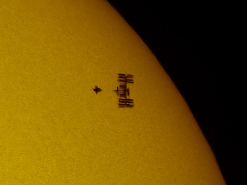 of how quickly the pair of spacecraft actually flew across the face of the Sun -- like the blink of an eye! It's amazing he was able to capture this incredible image at all, not to mention how clear and sharp the two spacecraft are in the photo, against the face of the otherwise spotless Sun. The shuttle's tail is even visible!