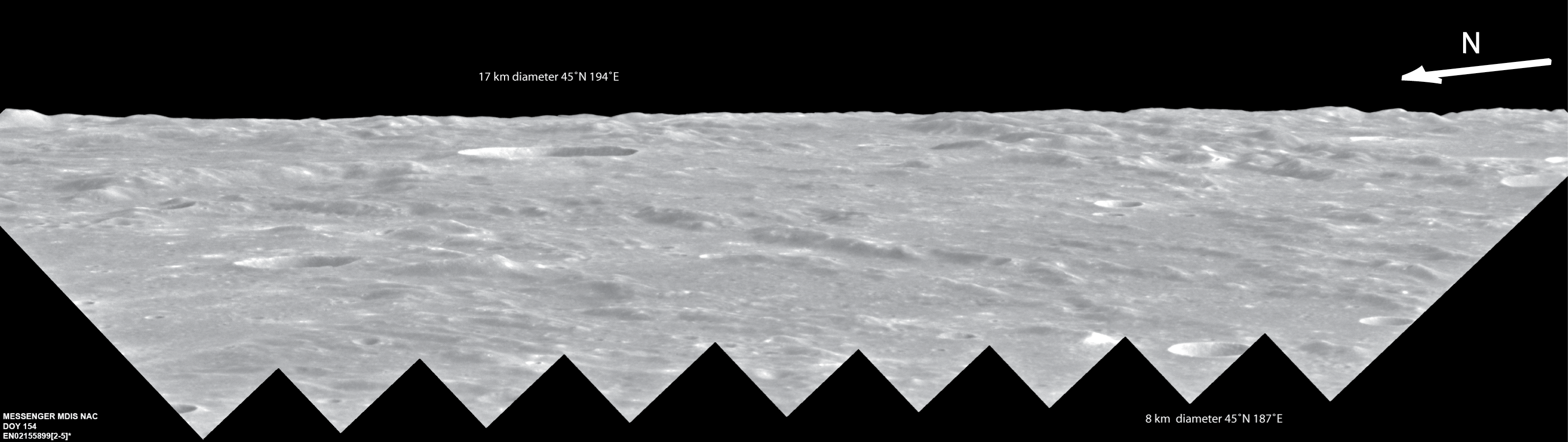 Here's a unique, jaw-dropping, and beautiful look at Mercury from the MESSENGER spacecraft, in a mosaic created from nine images taken by the Narrow Angle Camera (NAC) of the Mercury Dual Imaging System (MDIS). The camera took a "sideways" or oblique view of Mercury's limb, looking towards the horizon, providing a distinctive look at the rough terrain, ridges, craters and scarps of the Van Eyck Formation region, adjacent to the Caloris basin. Combining the images for a larger view not only provides a "you are there" feel, but it provides the science team with new ways to study Mercury's geology.