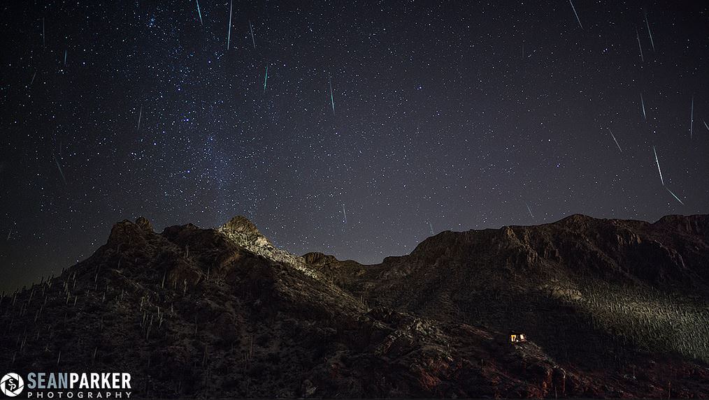 Geminids at Gates Pass. Composite image from 30 frames of video. Credit: