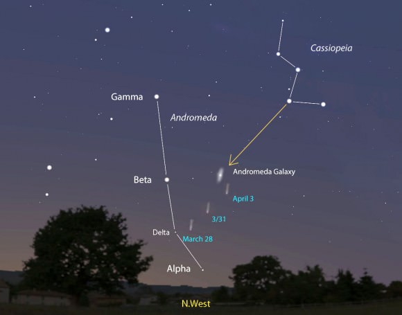 Comet PANSTARRS shown every three days as it moves across Andromeda, passing near the Andromeda Galaxy around April 3. You can use Cassiopeia to point you to Beta Andromedae and from there to the comet. The map shows the sky facing northwest about one hour after sunset. Comet and galaxy brightness are exaggerated for the sake of illustration. Stellarium[/caption]