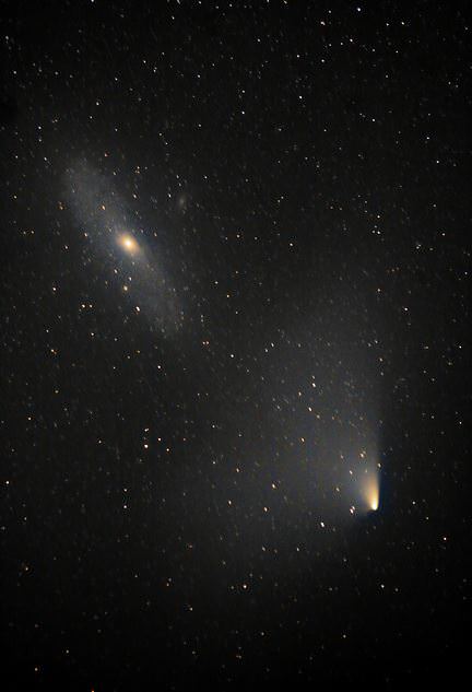 , and here's visual proof! In this comet encounter of the extragalactic kind, Comet PanSTARRS and the Andromeda Galaxy met each other in the skies above Earth. This great image by Brendan Alexander in Ireland shows the spectacular view. He said it was "a difficult image to capture due to low cloud, the low altitude of the target and tracking issue. I hope to get the chance to improve on this!"