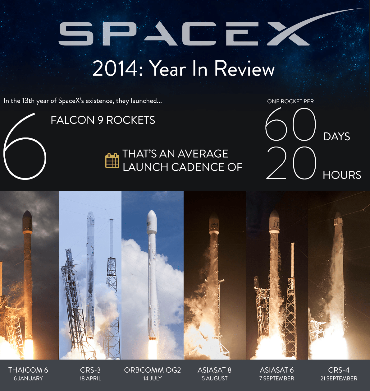 . "I thought I'd make an infographic summarizing SpaceX's 2014. Nothing new for those who are deep in the loop, but sometimes some perspective helps!"