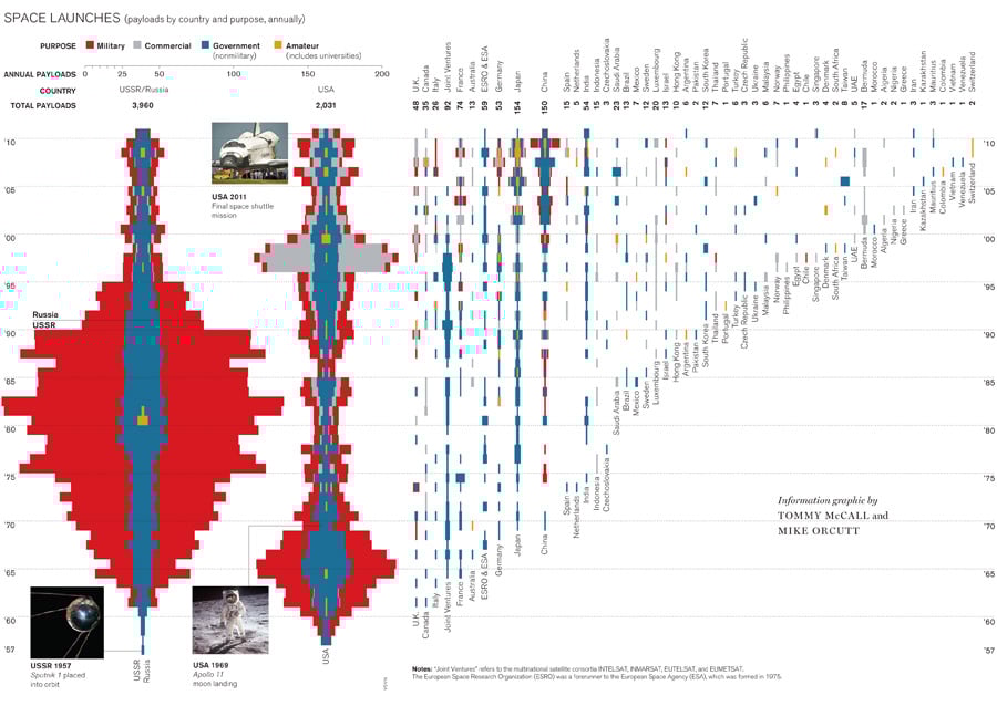 For people who erroneously believe that the end of the space shuttle program means the end of space exploration for the human race, this graphic should provide a little perspective. According to the data compiled here, human missions funded by the U.S. government have represented only a small part of the launches into space. And interestingly, the data creates nice Star Wars battle cruiser-like shapes for US and Russian launches!