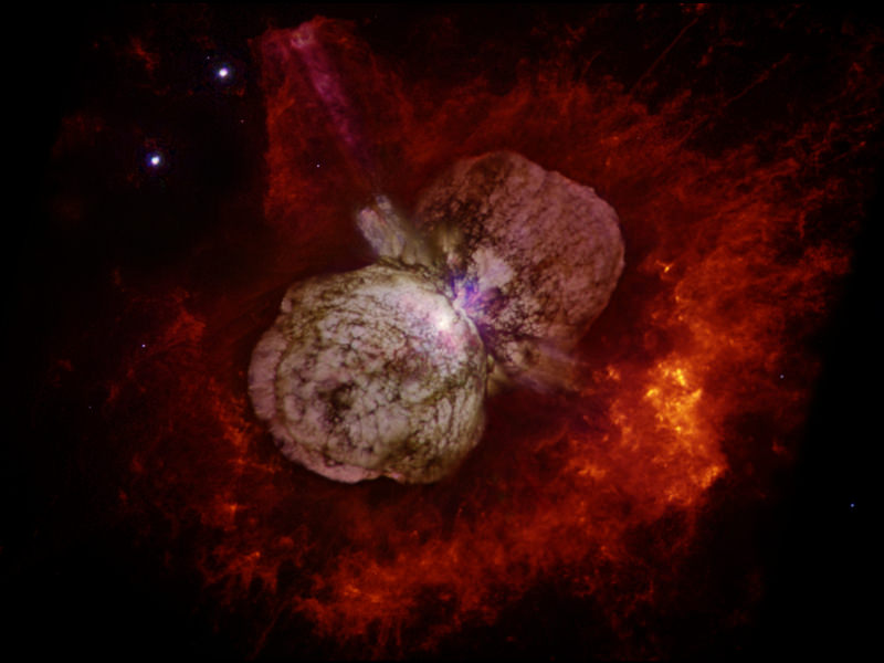 In the case of AG Carinea, that outburst took place about 10,000 years ago, and ejected about 10 times the Sun's mass and is approximately 5 light years across, a little more than the distance from the Sun to the Alpha Centauri system. Material from the explosion is then subjected to the immense solar winds coming from the supermassive star, which itself is still approximately 70 times the mass of the Sun.