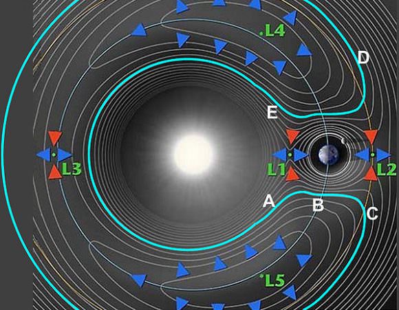 Illustration of the Sun-Earth Lagrange Points. Credit: NASA[/caption]