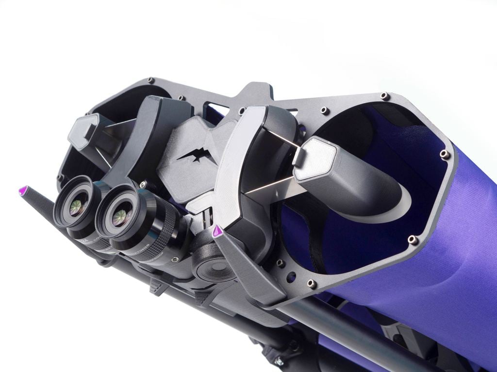 On the non-3D printed parts for the Swift, Robert notes: "The frame is all powder-coated and black anodized aluminum. The secondary mirror vanes are stainless steel. The mount axes are ground stainless steel shafts. The tertiary mirror mounts are research-grade kinematic mounts from Newport."