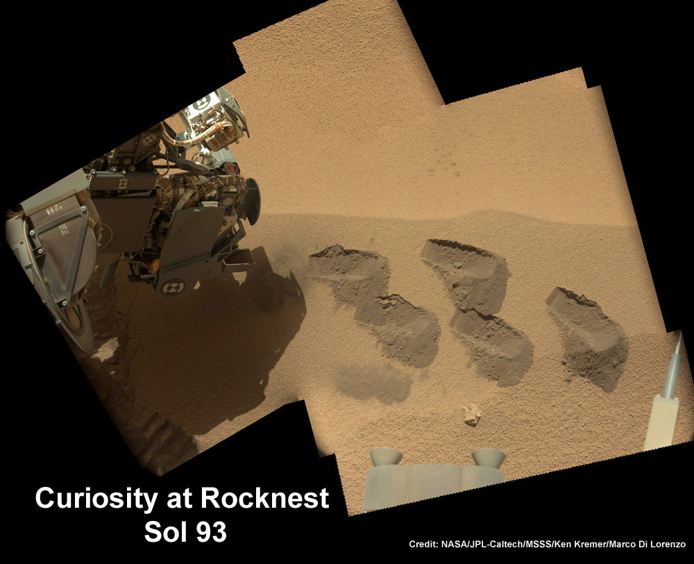 Image caption: Curiosity scoops repeatedly into this Martian soil at windblown ripple dubbed 'Rocknest', shown in this mosaic, and delivered samples to the SAM chemistry instrument, on the robots deck, to search for any signatures of organic molecules - the building blocks of life. This color mosaic was stitched together from hi-res color images taken by the robots 34 mm Mastcam camera on Sols 93 and 74. Credit: NASA / JPL-Caltech / MSSS/Ken Kremer / Marco Di Lorenzo