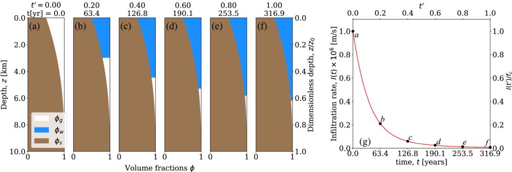 This figure illustrates how long it takes for water to infiltrate 10km deep into the Martian crust. The brown, white, and blue regions represent regolith, water, and gas in different volume fractions. The panel on the right shows the corresponding infiltration rate for each volume fraction (a through f). Image Credit: Shadab et al. 2025, Geophysical Research Letters.