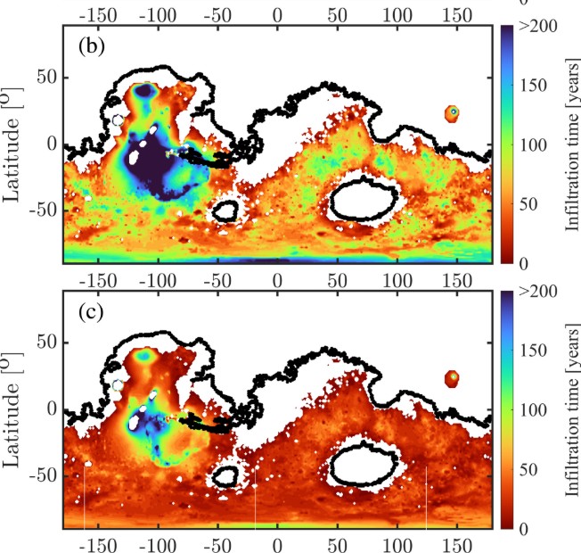 This figure shows water infiltration rates in two scenarios. The top panel is for a homogeneous crust with uniform hydraulic conductivity; the bottom panel is for a heterogeneous crust with power-law decay in porosity and permeability. Warmer colours represent faster infiltration rates close to 50 years, while the coldest colour represents a 200-year timeframe. Image Credit: Shadab et al. 2025, Geophysical Research Letters.