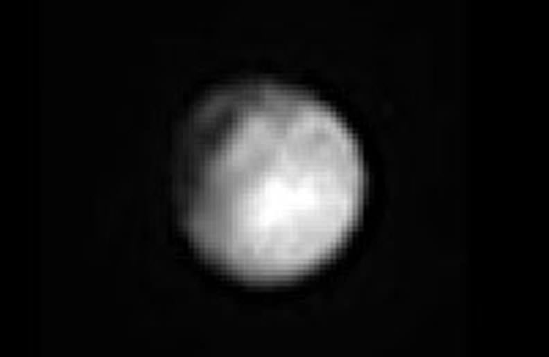 The latest photo of Pluto (lower left) and its largest moon Charon taken on June 29. A large possible crater-like feature is visible at lower right. Charon shows intriguing dark markings. Pluto's diameter is 1,471 miles (700 miles smaller than Earth's Moon); Charon is 750 miles across. Credit: NASA/Johns Hopkins University Applied Physics Laboratory/Southwest Research Institute[/caption]