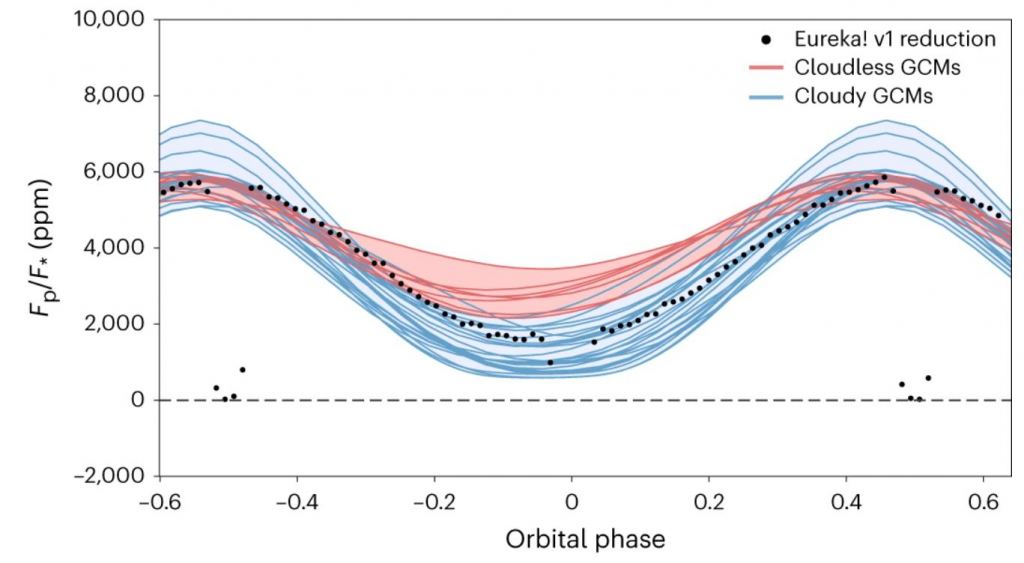 To put the data into perspective, the researchers compared WASP-43b's phase curve to General Circulation Model (GCM) simulations. The JWST phase curve data more closely matched a cloudy GCM than a cloudless GCM.