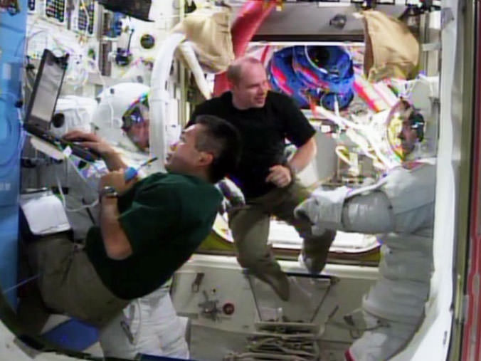 While Yurchikhin and Misurkin worked outside the ISS, the crew inside the ISS were separated and isolated from each other. Cassidy and station commander Pavel Vinogradov were sequestered in their Soyuz TMA-08M spacecraft that is attached to the Poisk module on the Russian segment due to the closure of hatches to the other passageways on the Russian side of the station which would have made the Soyuz inaccessible if there was an emergency. Parmitano and US astronaut Karen Nyberg were inside the U.S. segment of the station, and were free to move around since entry to their Soyuz vehicle (TMA-09M) was not blocked by hatch closures, since it is docked to the Rassvet module that is attached to the Zarya module.