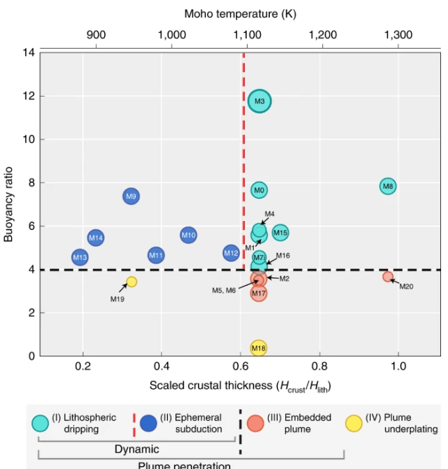 Depending on the different values for those parameters, they identified four types of interactions between the plume and the lithosphere.
