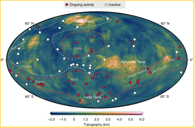 There's some evidence of recent volcanic activity, mostly in the form of coronae. Coronae are ring-like structures on the surface, caused by plumes of hot material flowing from the depths of the planet through the mantle and the crust. For the most part, scientists think these coronae are signs of ancient activity. But in this new study, the team identified 37 coronae that they say are still active.