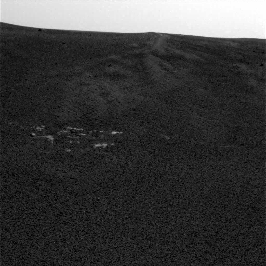 Opportunity captured this image with the left half of its PanCam, or Panoramic Camera. The rover had the solar filter on the camera at the time, which is why the image is so dark. The bottom is cut off because it was unable to transmit the entire image before losing power.