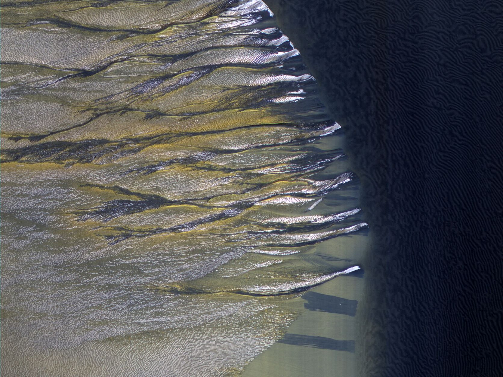 "Bright patches of frost (white in enhanced color) are clearly visible and are made up of water and carbon dioxide ices," writes HiRISE team member Susan J. Conway. "Dark streaks of sand have flowed down the dune's slope that sometimes covers the frost. These flows are caused by the rapid transformation of the frost from ice to gas as the sun heats the dune in the spring."
