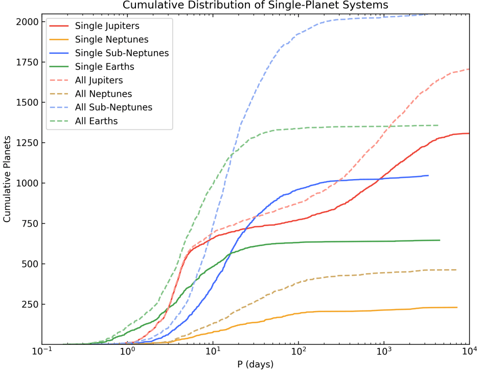"As expected, Jupiter-sized planets are far less likely to occur in multiplanet systems at periods of <10 days and virtually none do at <5 days, as indicated by the near-coincidence of the two Jupiter distributions at those periods. Meanwhile, roughly half of all other planet types and even a third of Jupiters at periods >10 days occur in multiplanet systems," the authors explain.