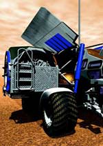 The Crew Lander and Rover will use powerful engines to hover before landing. The Rover's variable suspension will be capable of absorbing the shock of landing as well as increasing the Rover's ground clearance. In addition to the Rover's descent engines, the vehicle will serve as transport and mobile laboratory. A robotic manipulator and crane will allow the crew to interact remotely with the surface. Forward and dorsal docking tunnels simplify crew transfers to the Hab. Power will come from crygenic fuel tanks and a photovoltaic array. The vehicle's port side includes a centrifugal blower to keep dust to a minimum.