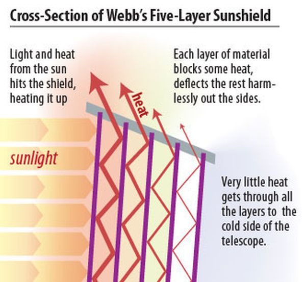 The sun-shield is five layers of a material called Kapton. Each of the layers is a specific thickness, and they are separated by a specific distance. The shield also has seams and other features that reinforce it against meteors. Each of the layers is coated with aluminum, and the two layers closest to the Sun, Layers 1 and 2, have what's called a "doped silicon" coating to reflect the Sun's ultraviolet energy back into space.