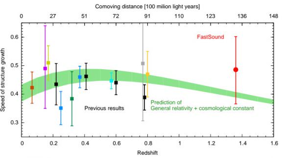 Experimental results looking at the expansion of the universe, in comparison to that predicted by Einstein's theory of general relativity in green. Credit: Kavli IPMU/Okumura et al.[/caption]