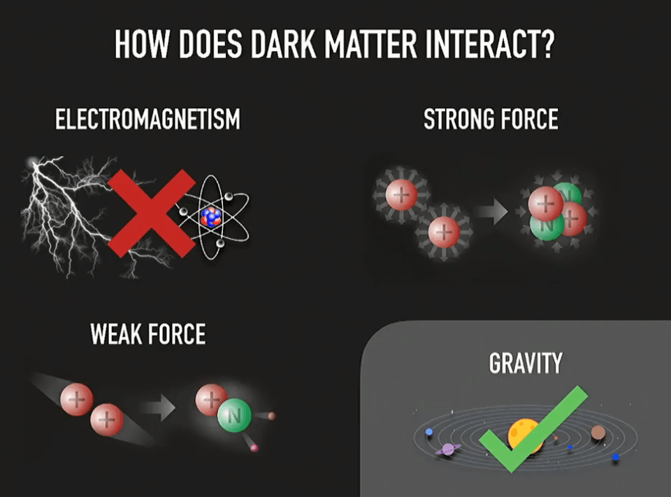 A central property of dark matter is that it doesn't interact strongly with regular matter or light. Since it makes up most of the matter in the cosmos, it must be almost invisible otherwise we would have seen it long ago. But it should interact with regular matter in subtle ways, similar to the way neutrinos interact with matter.