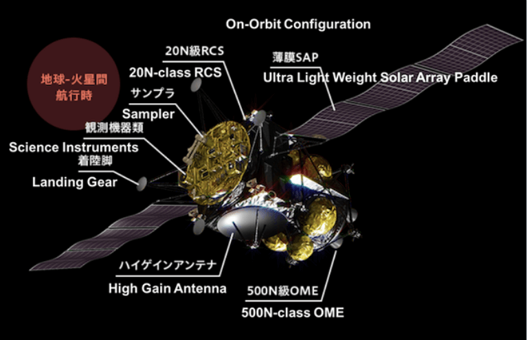 The JAXA-built instruments include a telescopic (narrow-angle) camera for observing detailed terrain, the wide-angle camera for identifying hydrated minerals and organic matter, the LIDAR laser altimeter, a dust monitor and a mass spectrum analyzer, to study the charged ions around the moons, the sampling device and sample return capsule, and a radiation environment monitor.
