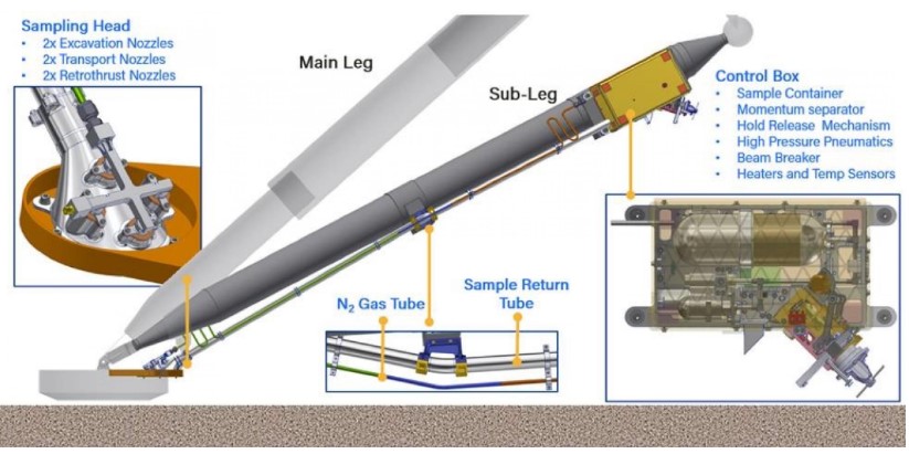 The Pneumatic Sampler will be positioned near the footpad on one of the lander's legs. It'll use pressurized nitrogen gas to gather the samples, and mission operators can manipulate the gas flow depending on requirements. It can be either continuous or pulsed.