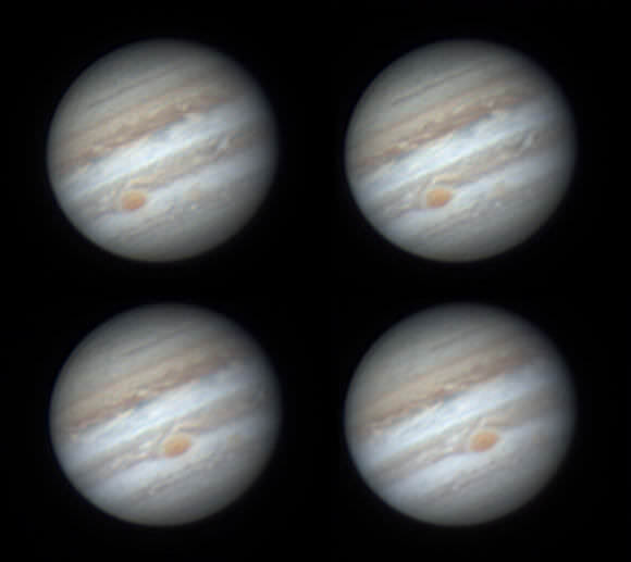 on the cloudtops of Jove. You can see smaller storms come and go as the Great Red Spot make its circuit once every 10 hours. Follow Jupiter from sunset through sunrise, and it will rotate just about all the way around once. Strange to think, we've been using modified