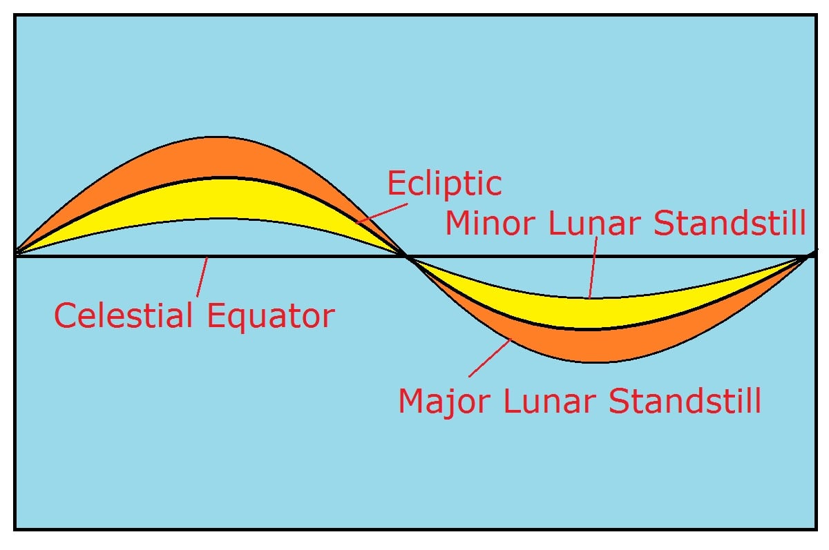 Now, this doesn't happen on most years. The cycle spans almost a 20 year generation, at 18.6 years from one Major Lunar Standstill to the next. In between those 'hilly' years, the Moon's path versus the ecliptic goes 'shallow' versus the ecliptic, known as a Minor Lunar Standstill.