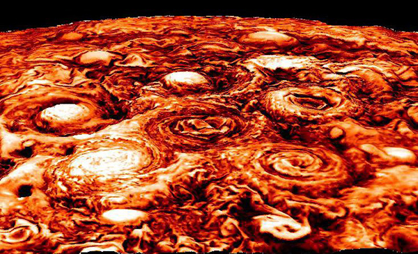 The radio occultation soundings showed that the area of Jupiter's north polar stratospheric cap is a pretty balmy 11 degrees Celsius (about 51 F). The region is surrounded by high-speed winds that clock a decent 161 km/hour (100 mph). In addition, Juno's JunoCam and JIRAM have observed the motion of a giant polar cyclone, along with eight smaller ones that circle around it. These seem to stick to the polar region, although they tend to drift and migrate toward the poles in a cycle. As they move together, these interact and slow down over time. On Earth, most cyclones also drift to the poles, but break up as they lose access to moist air and warm temperatures that normally sustain them. Atmospheric modeling based on the Jovian cyclonic actions could well help explain how similar storms work on Earth and other planets.