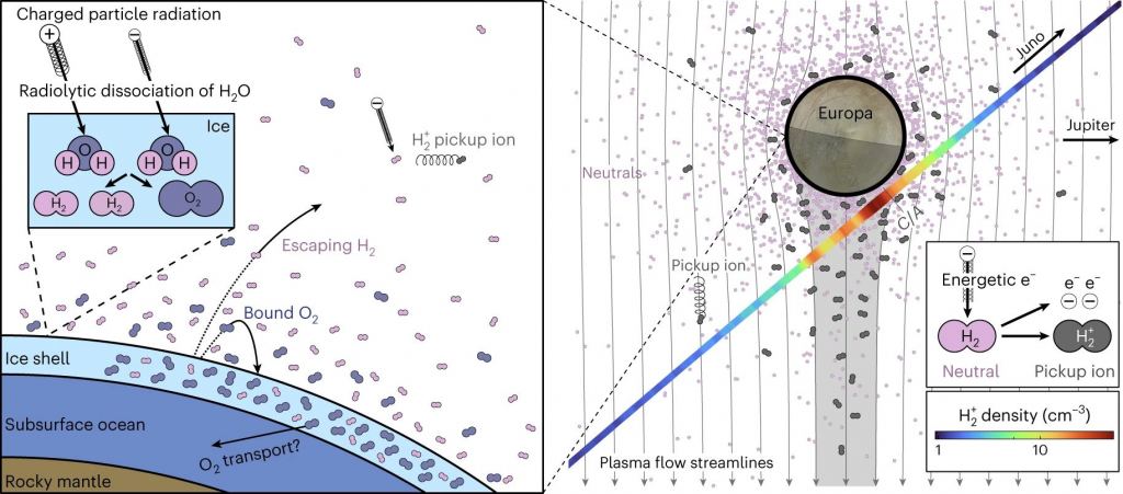 Jupiter's enormously powerful magnetic field sends a constant stream of charged particles at Europa. The much smaller moon has no defence. When those particles strike Europa's icy surface, they split water molecules apart and produce hydrogen and oxygen.