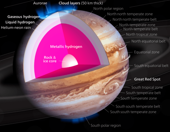 Results from Juno's first data-pass suggest that Jupiter's powerful magnetic field is generated closer to the surface than previously thought. It may be generated above the core of metallic hydrogen. Image: By Kelvinsong - Own work, CC BY-SA 3.0, https://commons.wikimedia.org/w/index.php?curid=31764016[/caption]