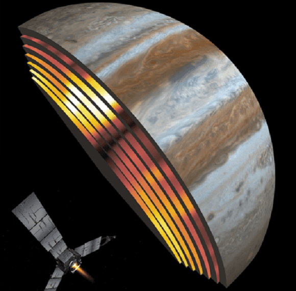 This artist's illustration shows Juno's Microwave Radiometer observing deep into Jupiter's atmosphere. The image shows real data from the 6 MWR channels, arranged by wavelength. Credit: NASA/SwRI/JPL[/caption]