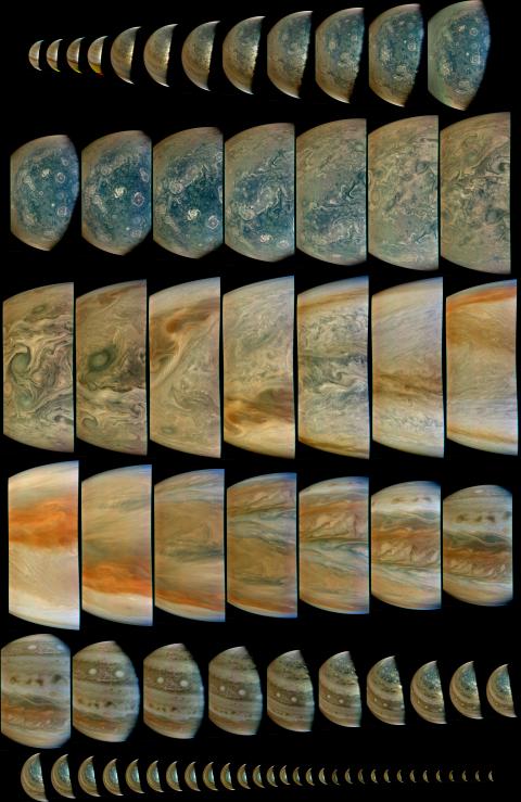As soon as the data from Perijove 42 was sent back to Earth, citizen scientist image editing experts around the world got to work. Kevin Gill decided to process the whole batch into one grandiose mosaic.