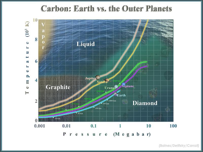 Recent data compiled by planetary scientists Mona L. Delitsky of California Specialty Engineering in Pasadena, California, and Kevin H. Baines of the University of Wisconsin-Madison, has been combined with newly published pressure temperature diagrams of Jupiter and Saturn. These diagrams, known as adiabats, allow researchers to decipher at what interior level that diamond would become stable. They also allow for calculations at lower levels - regions where both temperature and pressure are so concentrated that diamond becomes a liquid. Imagine diamond rain... or rivulets of pure gemstone.