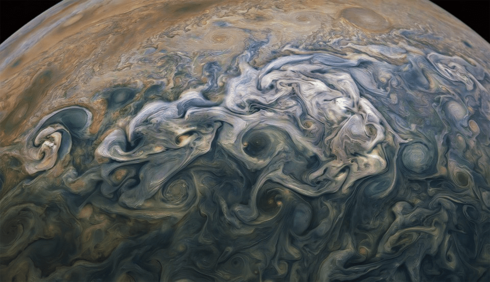 The intricate swirls visible in Jupiter's uppermost cloud layer are likely caused by higher temperatures deeper in the layers of the atmosphere, and by the planet's rotation.
