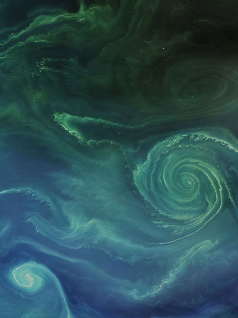 The image of Earth is of the Baltic Sea near Finland, where a phytoplankton bloom is in full swing. When there are plenty of nutrients, and when temperature and salinity are just right, phytoplankton reproduces rapidly, sometimes changing the appearance of the water. The ocean currents created the swirling flow patterns in the image. The image was captured by the Operational Land Imager on Landsat-8.
