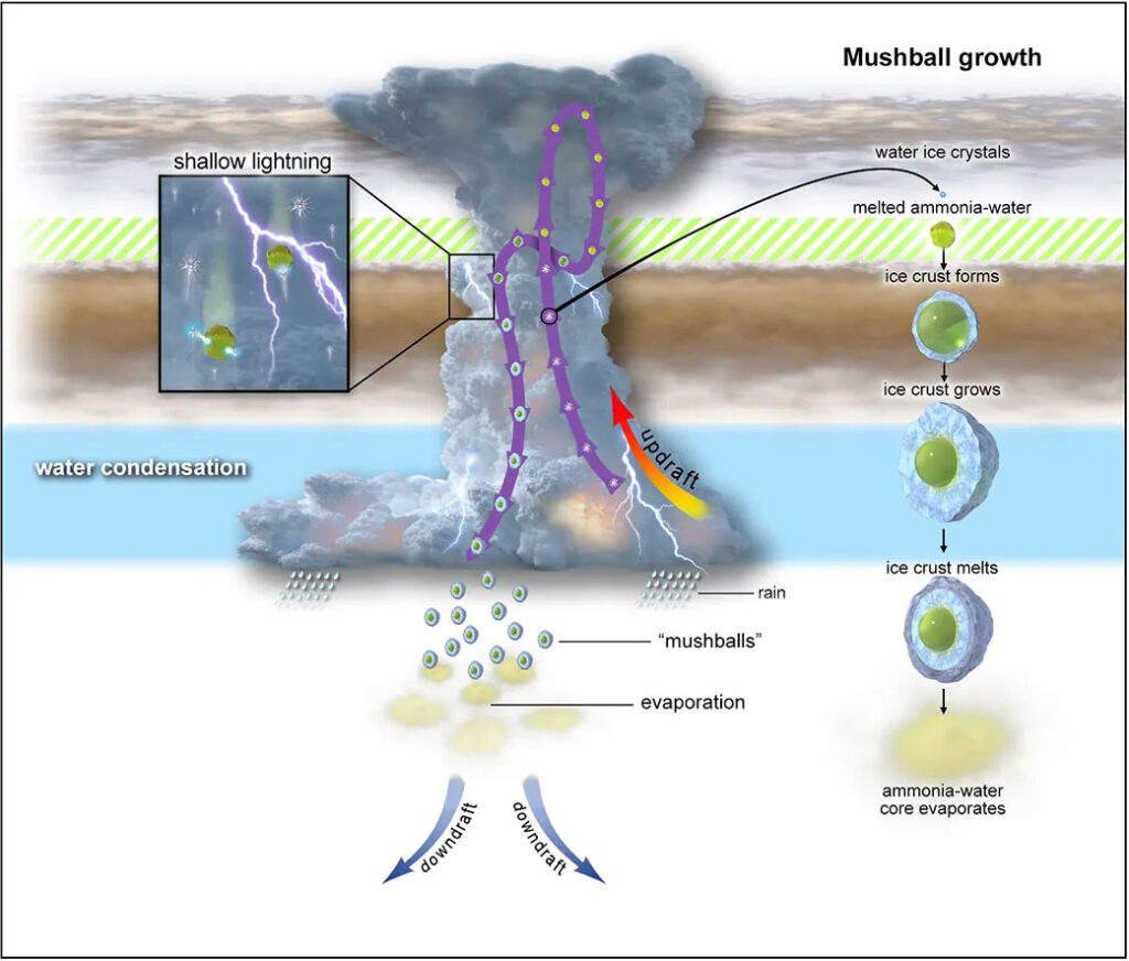 An illustration depicting how violent storms on Jupiter — and likely other gas giants — generate mushballs and shallow lightning. The mushballs are created by thunderstorm clouds that form about 65 km (40 miles) beneath the cloud tops and fuel a strong updraft that carries water ice upward to extreme altitudes, occasionally above the visible cloud layer. Once they reach altitudes of about 22 km (14 miles) below the visible cloud layer, ammonia acts like an antifreeze, melting the ice and combining with it to form a slushy ammonia-water liquid that gets coated with water ice — a mushball. The mushballs keep rising until they become too heavy and fall back through the atmosphere, growing until they reach the water condensation layer, where they evaporate. This ends up redistributing ammonia and water from the upper atmosphere (green and blue layer) to layers deep below the clouds, creating areas of depleted ammonia visible in radio observations.