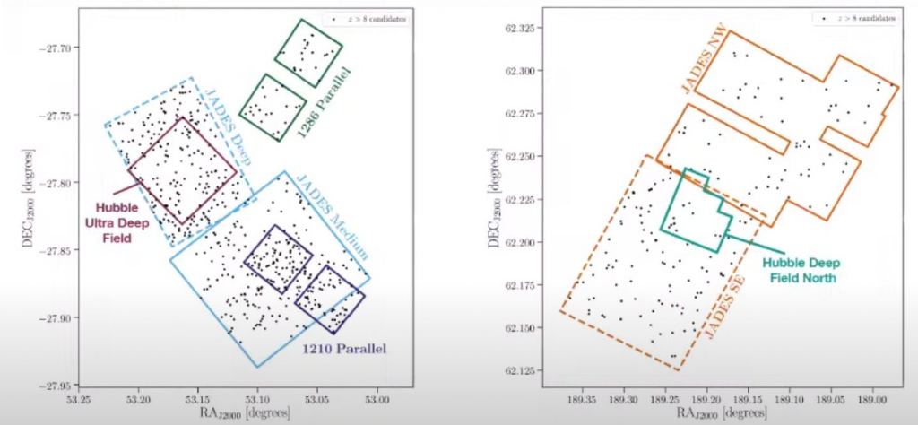 JADES is revisiting a region of the sky familiar to astronomy buffs: the Hubble Ultra Deep Field (HUDF.) The HUDF is a deep-field image of a small region of the sky that took over 11 days of observations spread over months by the Hubble Space Telescope to capture. It contains about 10,000 galaxies, and the smallest, reddest ones are from when the Universe was only about 800 million years old.